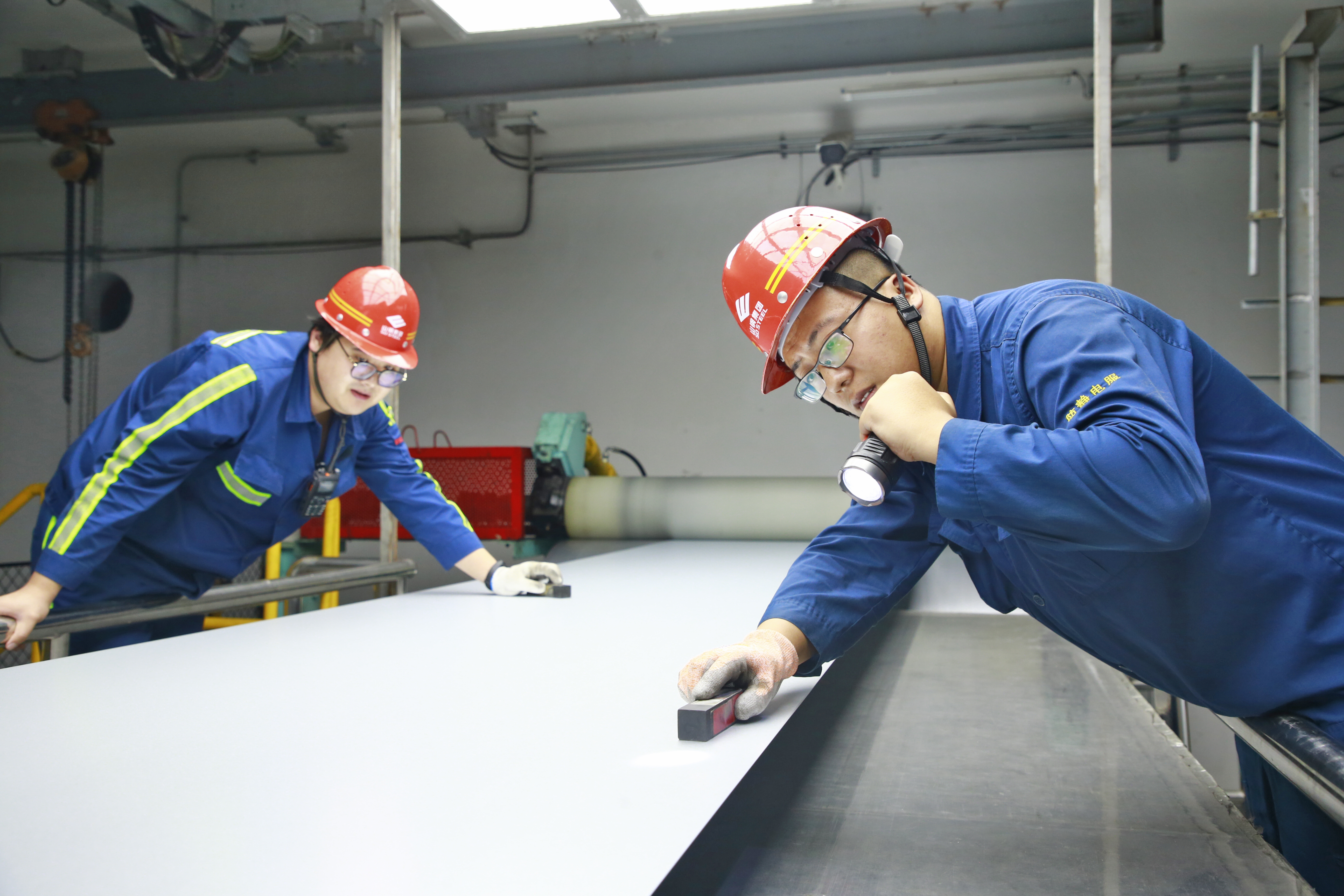 “质量月”活动开展以来,日照公司冷轧厂成立产品质量提升团队,以“重大质量异议为零、质量攻关项目指标进步率70%以上”为目标,围绕提高汽车面板成材率、降低酸洗厚规格头尾划伤等重点工作开展攻关,不断提升质量管控水平和产品质量。图为该厂职工正在检查产品表面质量。(杨位钦 侯可双 摄)
