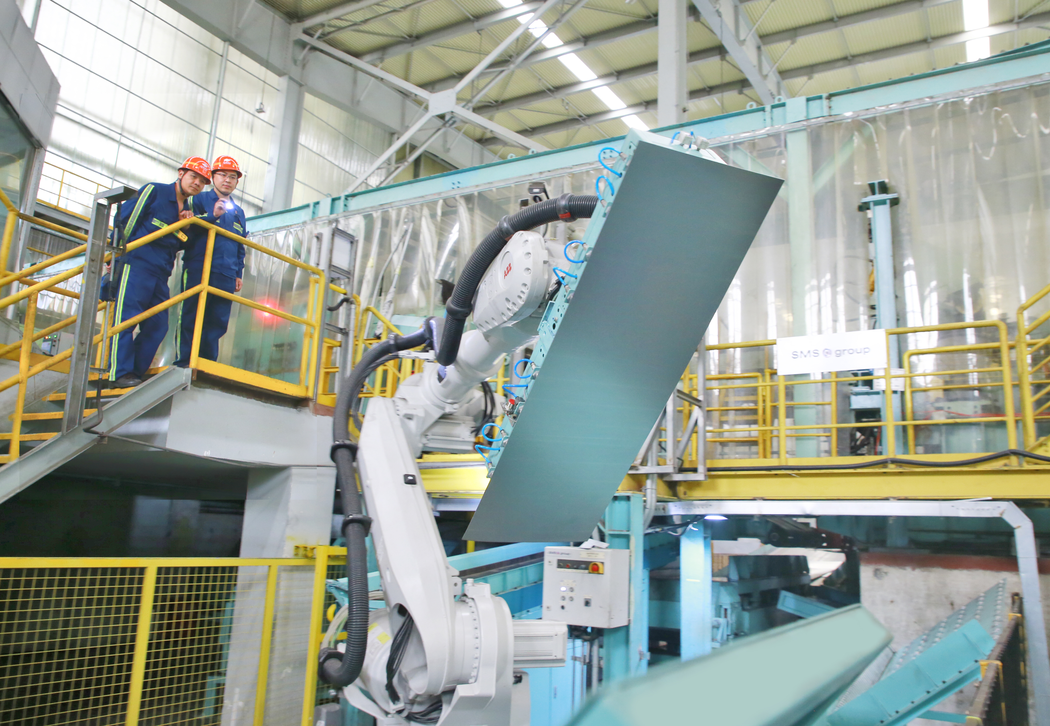日照公司高度重视智能制造工作,持续推进以“四个一律”为核心的智能化工厂建设,以智能化、数字化促进运营效率、工作效能全面提升。目前,该公司共上线各类智能机器人100余台,自动喷号机、无人行车等普遍应用于各条产线。图为该公司冷轧厂职工正在观察智能取样机器人运行情况。(杨位钦 摄)